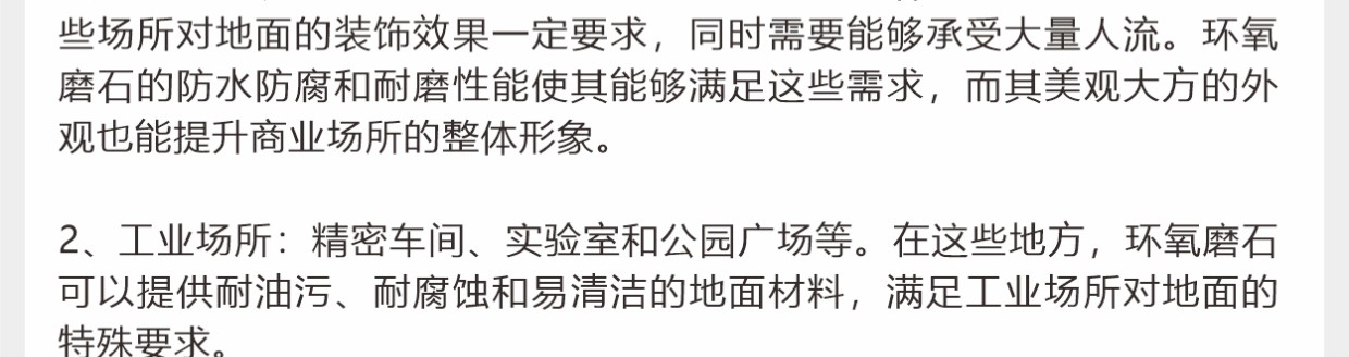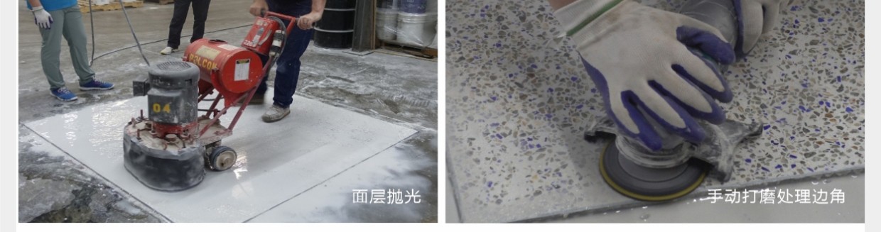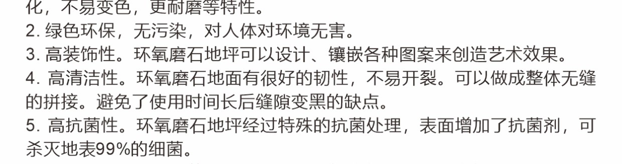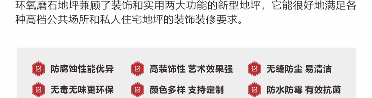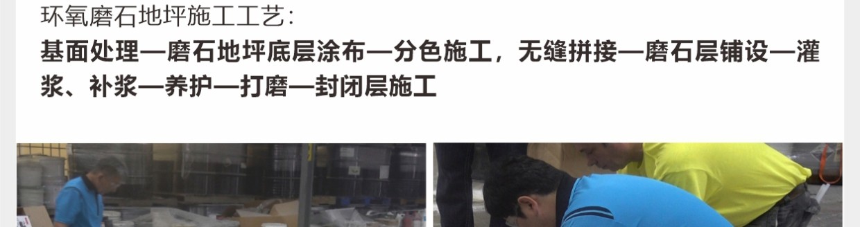 彩田環(huán)氧磨石地坪是以環(huán)氧樹脂為粘接料,以天然石材粒、金屬顆粒、玻璃粒、合成碎?;蚱渌b飾性材料等天然骨料,模仿水磨石地坪施工工藝的有機(jī)磨石地坪。環(huán)氧高分子樹脂,與各種骨料混合后經(jīng)現(xiàn)場(chǎng)澆筑(攤鋪)、研磨、拋光等經(jīng)過(guò)20多道精湛工藝而打造出的一種整體無(wú)縫的裝飾性地面。環(huán)氧磨石地坪除滿足正常的功能性需求以外,還可以滿足地坪裝飾性,還具有較高的藝術(shù)觀賞價(jià)值。