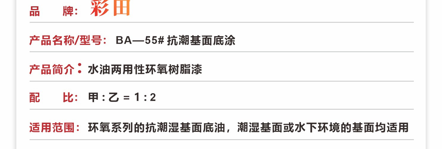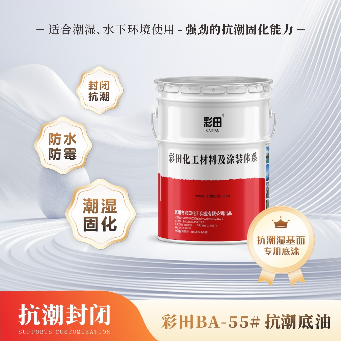 彩田BA-55#底油,是利用分子結構設計原理,采用特殊原料和生產(chǎn)工藝,合成的一種特殊結構適應潮濕或者水下環(huán)境條件下使用的高強度的特殊改性環(huán)氧底油;在水下或者潮濕環(huán)境中極具穿透水膜能力而使得漆膜具有強烈的浸潤粘結與固化性能,其固化物粘結強度同干燥環(huán)境下相比較保持率達到95%以上;特別適合用在潮濕基面或水下環(huán)境中。