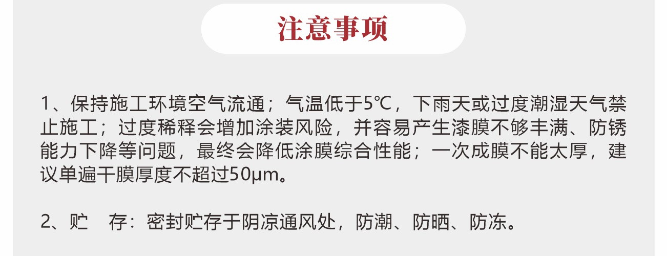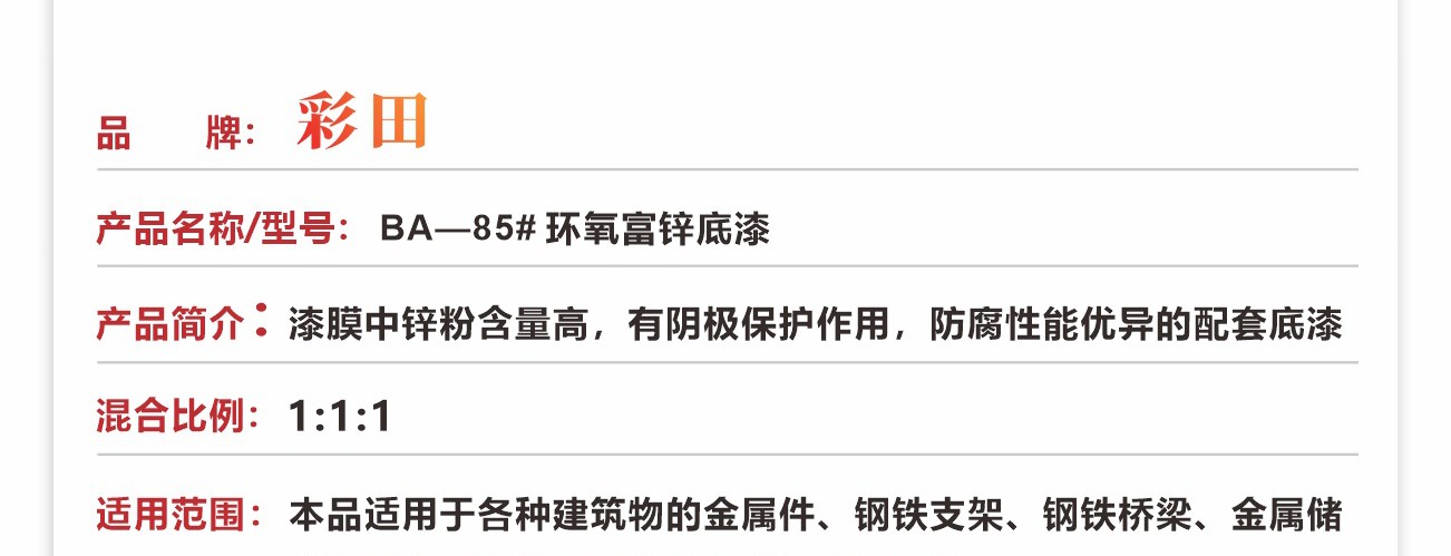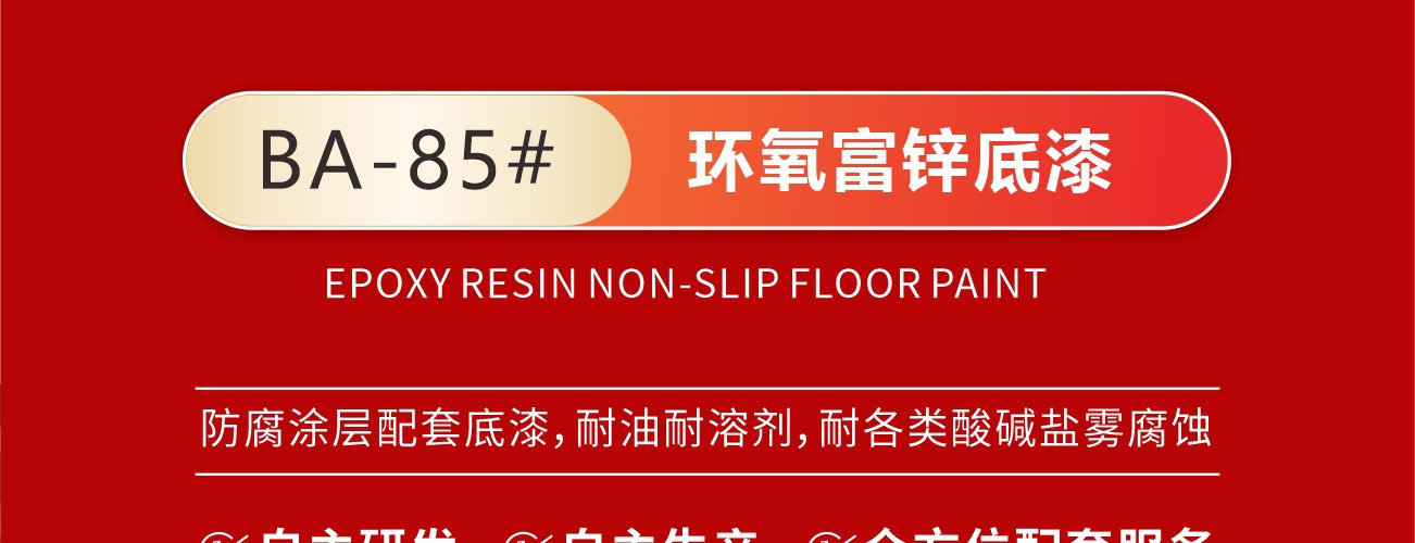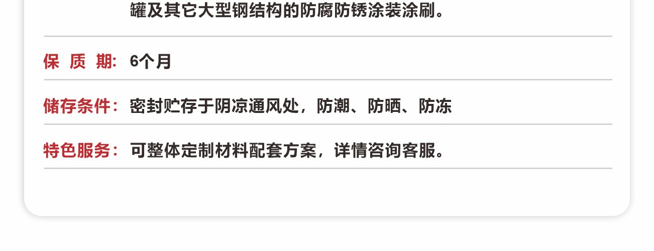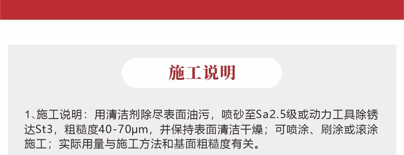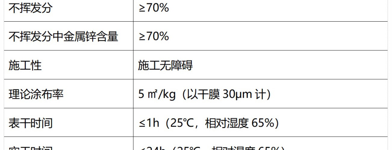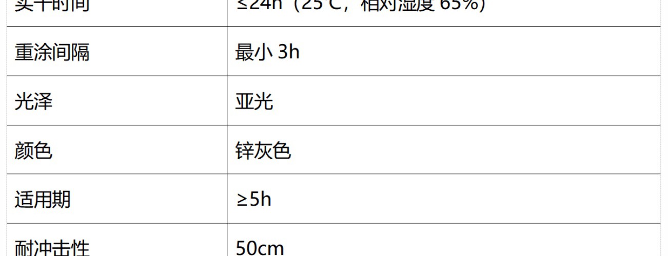 環(huán)氧富鋅底漆,鋅粉含量≥70%,適用于各種建筑物的金屬件、鋼鐵支架、鋼鐵橋梁、金屬儲罐及其它大型鋼結(jié)構(gòu)的防腐防銹涂裝涂刷。 特 性:優(yōu)異的防腐蝕性能;優(yōu)良的耐油性、耐溶劑性、耐水性及耐鹽霧性;良好的基材表面附著力。