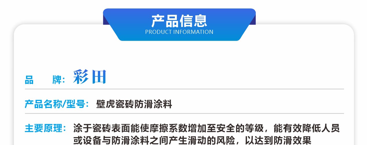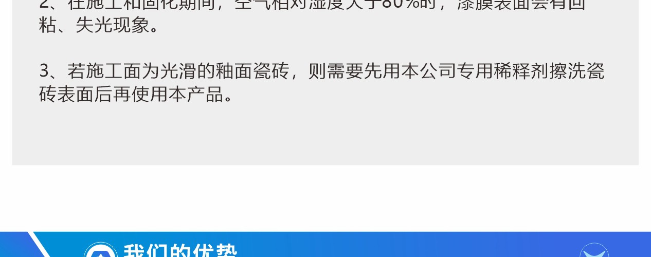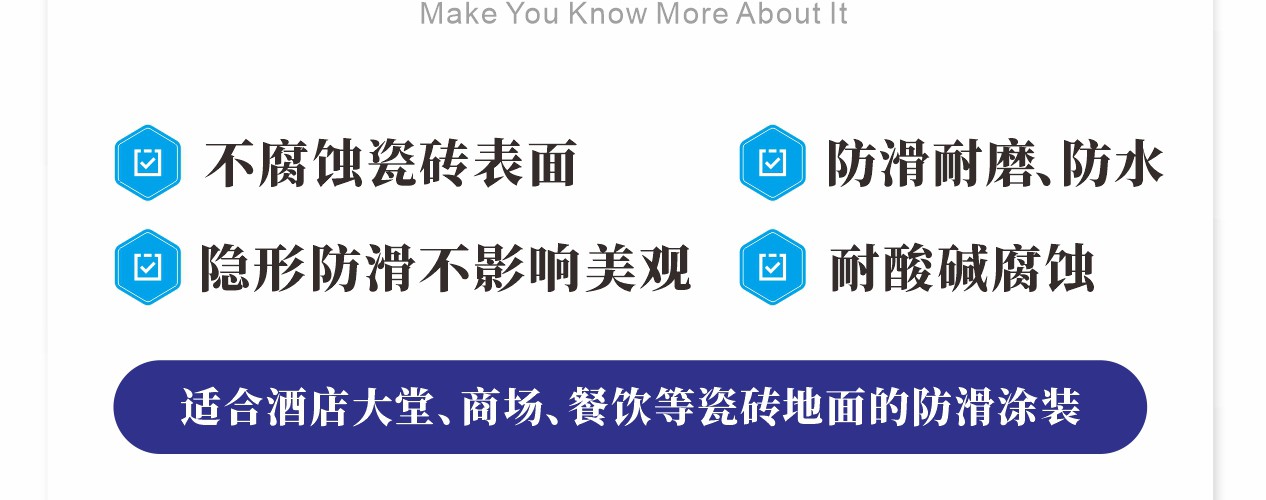 具有無縫防塵,易清潔,耐酸堿,防腐蝕等優(yōu)良性能;干燥快,縮短施工周期;漆膜摩擦系數(shù)大,具有防滑性;漆膜具有吸音效果,不會產(chǎn)生環(huán)氧樹脂地坪那樣的噪音;優(yōu)異的耐候性,可用于戶外。 用途:適用于酒店大堂、寫字樓等各種瓷磚地面防滑涂裝。是一種涂施于物體表面能使摩擦系數(shù)增加至安全的等級,能有效降低人員或設備與防滑涂料之間產(chǎn)生滑動的風險,以達到防滑效果。
