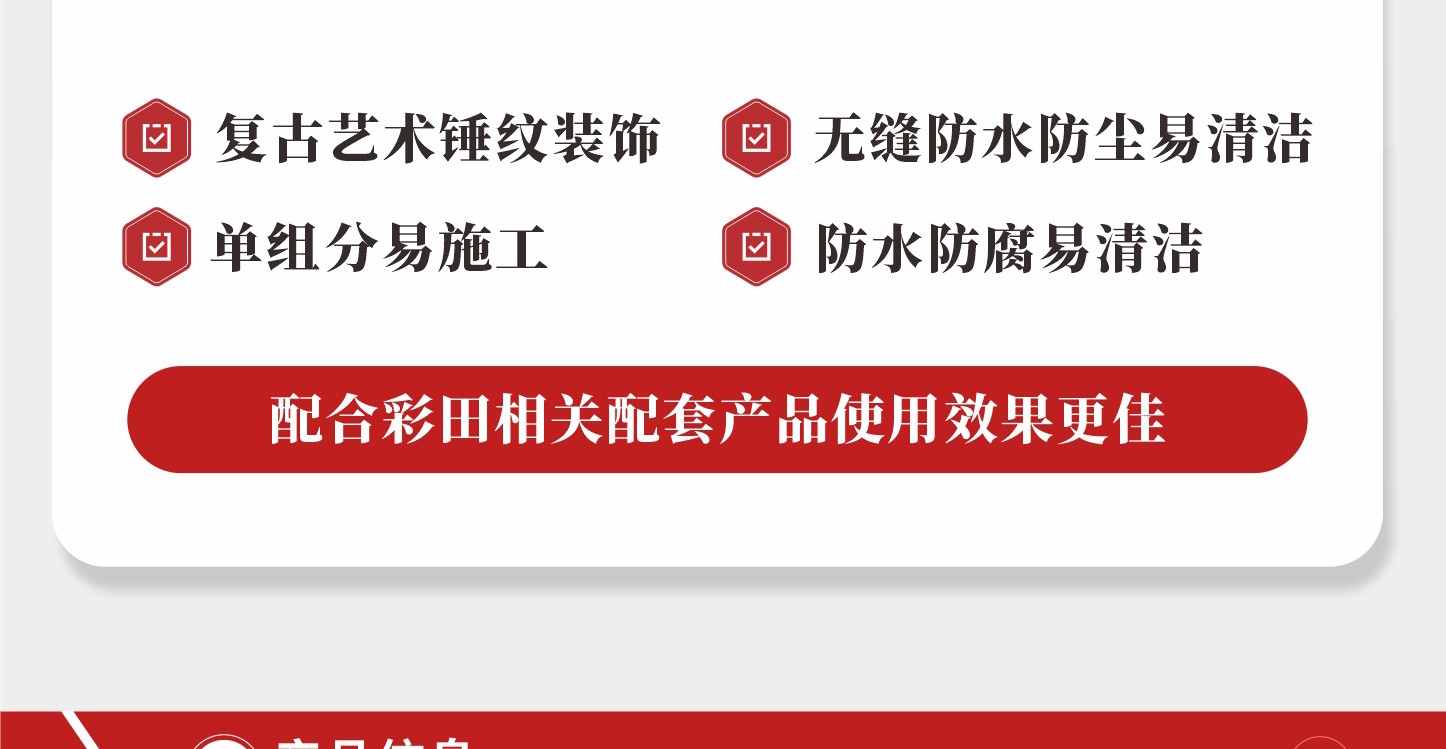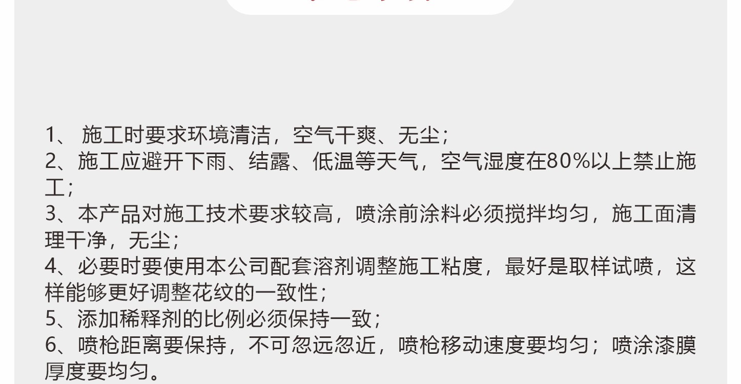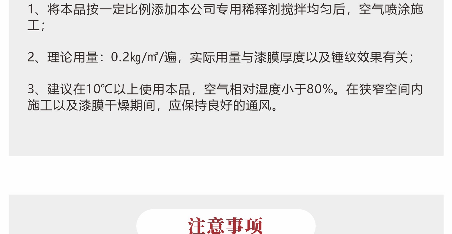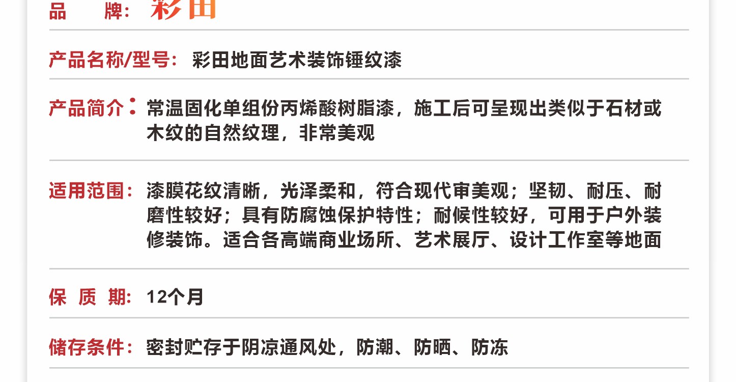 彩田的丙烯酸錘紋漆是一種常溫固化單組份丙烯酸樹(shù)脂漆,施工后可呈現(xiàn)出類(lèi)似于石材或木紋的自然紋理,非常美觀。 特 性:漆膜花紋清晰,光澤柔和,符合現(xiàn)代審美觀;堅(jiān)韌、耐壓、耐磨性較好;具有防腐蝕保護(hù)特性;耐候性較好,可用于戶外裝修裝飾。 用 途:適用于室內(nèi)外裝飾設(shè)計(jì)使用,尤其是復(fù)古風(fēng)格、鄉(xiāng)村風(fēng)格、歐美風(fēng)格等方面的涂飾涂裝。