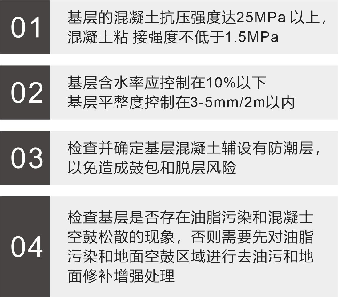 對于新混凝土基層要求水泥標號達C25以上,砼養(yǎng)護15天以上。在-10℃至65℃溫度范圍內(nèi)保持其物理性能。