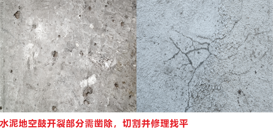 清除舊地坪,去除松散結(jié)構(gòu),提供粗糙、清潔、堅實的基層。如果基層有空鼓、開裂現(xiàn)象,則需要鑿除、切割并修理找平。