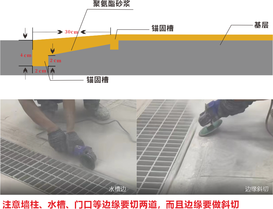 錨固槽必須垂直規(guī)整,寬度、深度應(yīng)達到地坪厚度的2倍,且最小要達到5毫米,距墻邊小于100毫米(越近越好),與墻體保持平行,并且其圍繞的面積不超過25平方米。