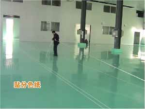 在環(huán)氧地坪需劃線的地方貼美紋紙,形成兩條平行的直線。美紋紙是以皺紋紙為基材,涂以特殊壓敏膠制造而成的,具有保護(hù)、固定、保持力好、抗拉強(qiáng)度佳、易撕起、不殘膠等特性的膠粘帶。其美紋效果界線清晰、明朗,又兼具弧線美術(shù)效果。