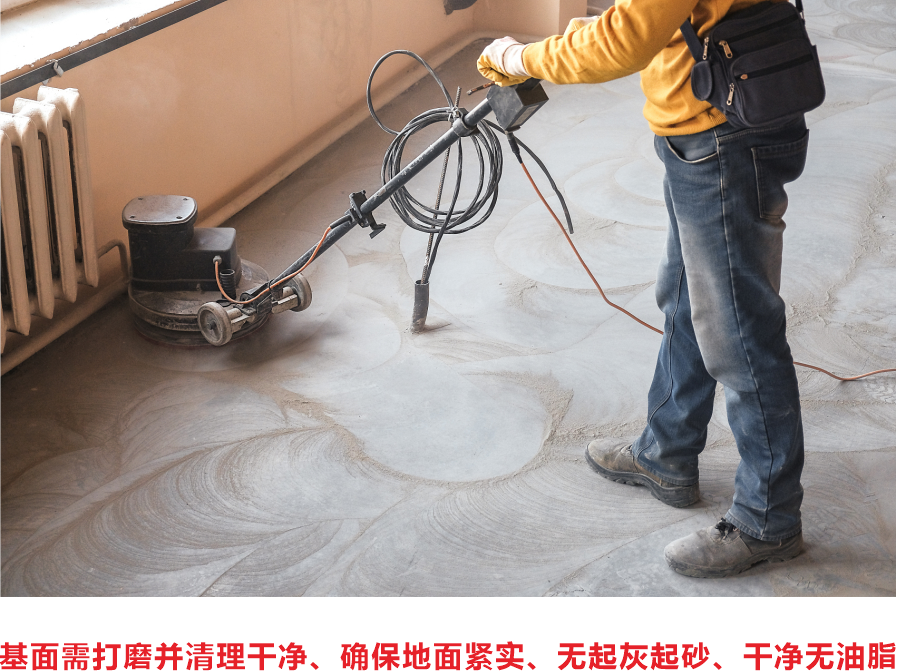 基層處理與完成地坪質(zhì)量密切相關(guān)。使用專(zhuān)業(yè)的無(wú)塵混凝土研機(jī)和手提磨機(jī)進(jìn)行表面處理,清除地面上舊的涂層,需要的區(qū)域可采用銑刨機(jī)、拋丸機(jī)進(jìn)行處理。