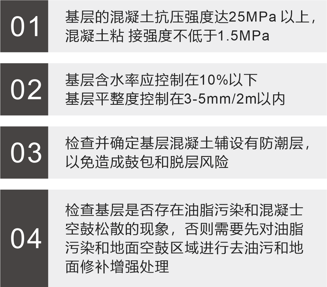 要求: 清除舊地坪,去除松散結(jié)構(gòu),提供粗糙、清潔、堅(jiān)實(shí)的基層。如果基層有空鼓、開(kāi)裂現(xiàn)象,則需要鑿除、切割并修理找平。對(duì)于新混凝土基層要求水泥標(biāo)號(hào)達(dá)C25以上,砼養(yǎng)護(hù)15天以上。