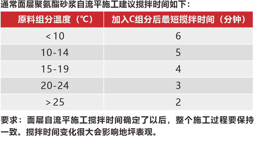面層施工避免在結(jié)露天氣進(jìn)行。材料的最佳使用溫度為15℃-30℃,必須使用機(jī)械混合。