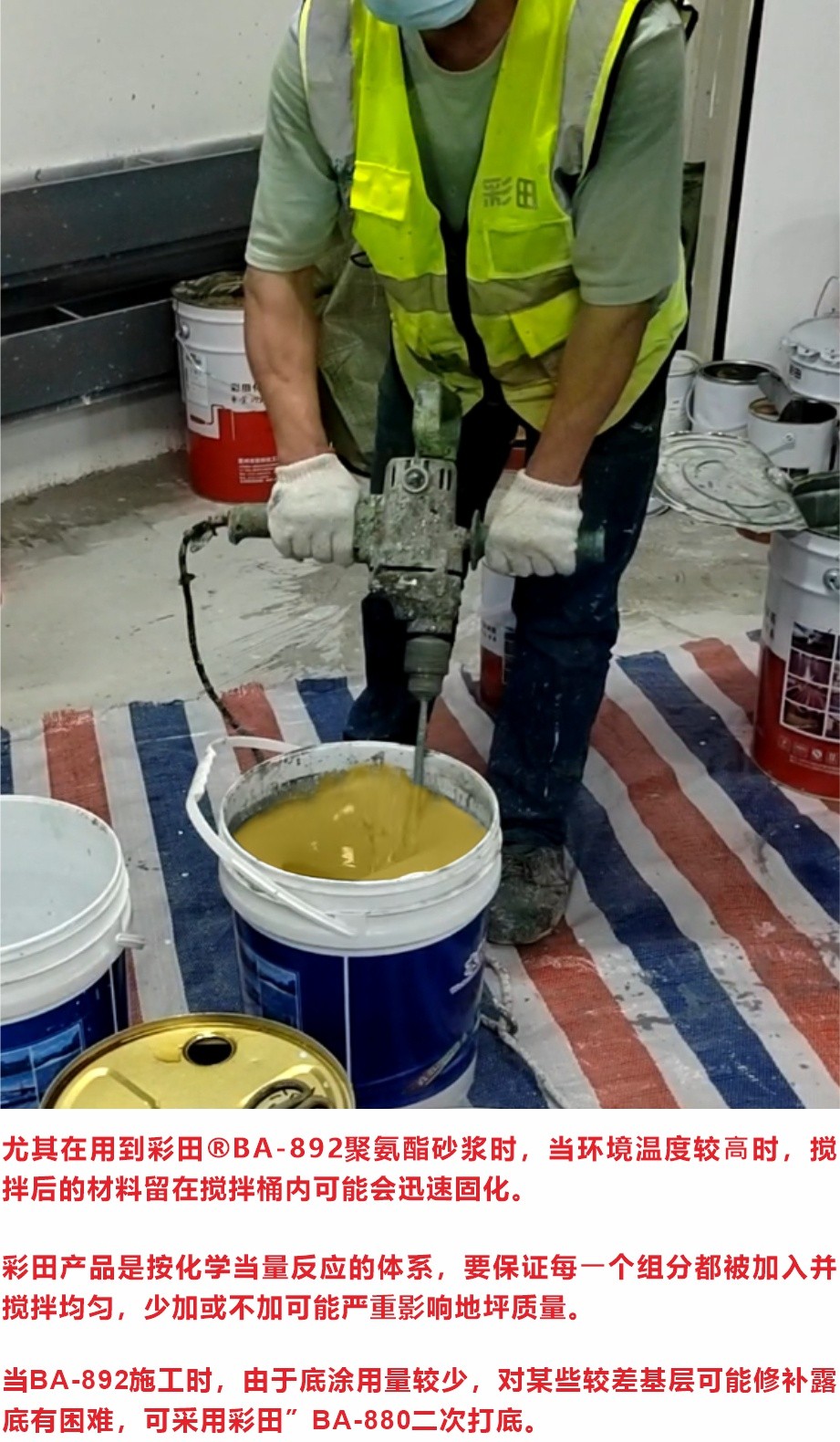 4) 逐漸加入C組分,同時(shí)繼續(xù)攪拌,直到混合均勻,沒(méi)有聚集顆粒,一般需2分鐘。彩田產(chǎn)品是按化學(xué)當(dāng)量反應(yīng)的體系,要保證每?個(gè)組分都被加?并攪拌均勻,少加或不加可能?chē)?yán)重影響地坪質(zhì)量。