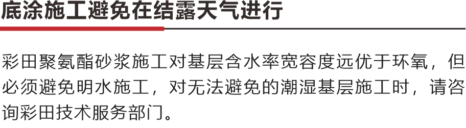 要求:底涂應(yīng)與混凝土地面充分結(jié)合達(dá)到一個(gè)封閉的涂層,對(duì)露底部位須進(jìn)行修補(bǔ);底涂至少需要固化6-36小時(shí)以上方可實(shí)施面涂,但不得超過(guò)72小時(shí),以達(dá)到將來(lái)與面涂最好的附著力并且避免因底涂未充分固化而造成面層鼓包。如果完成后超過(guò)72小時(shí)或被露水污染過(guò),則需重新打磨后方可進(jìn)行面層施工或再次打底。