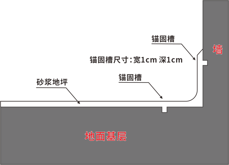 在門(mén)口、柱子、設(shè)備基座、地坪開(kāi)放邊界、基層混凝土施工縫和誘導(dǎo)伸縮縫兩邊、將來(lái)任何聚氨酯砂漿面層需切割伸縮縫的兩邊、以及面層需分區(qū)施工的界線(xiàn)的兩邊也須按此法預(yù)先切割錨固槽。錨固槽切割圖示范如右圖。