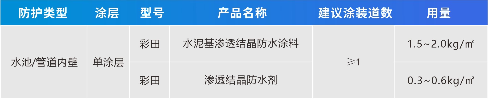 本方案采用滲透結晶單涂層體系,即安全無毒、高滲透性和強封閉性的滲透結晶型涂料對池壁進行防水防護。涂刷后的涂料滲透到混凝土的孔隙中發(fā)生原位固化交聯(lián),能有效封閉混凝土的微觀孔隙并對基面微裂縫具有自修復能力。阻擋水及其他介質進入混凝土,防止有害物質析出到飲水中。實現(xiàn)對混凝土的結構增強及對飲用水水質保護的雙重功能。