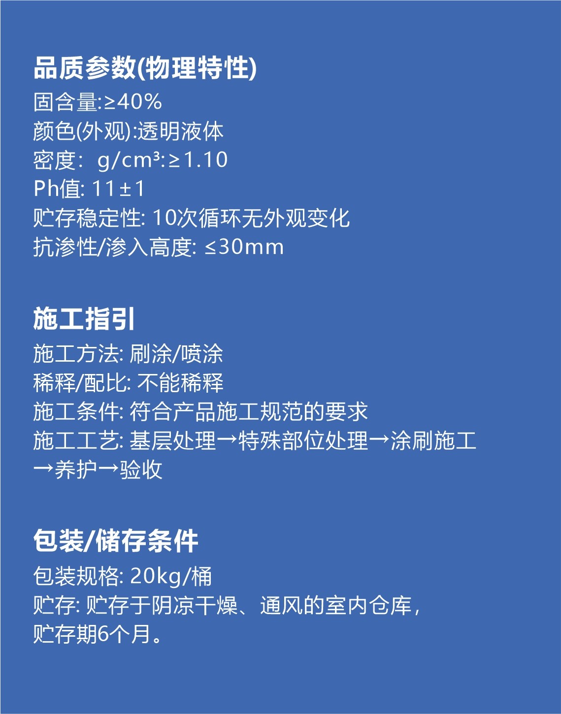 3、具有滲透功能,能通過化學反應滲透到混凝土內部產(chǎn)生結晶堵住混凝土的毛細孔。