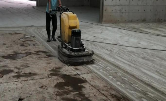 關(guān)于地面找平,由于面漆有自流性,為防止面漆在地面上薄厚不均勻,因此地面必須打磨(注意:地面打磨要避免打磨過度,將地面石子打磨出來)。利用靠尺將地面不平整處(凸起部分)全部找出并用記號(hào)筆做出標(biāo)記,利用自吸塵打磨機(jī)將地面打磨平整。