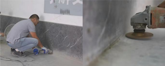 使用空鼓錘將所有施工地面空鼓部分找出,并利用切割機(jī)切開,電錘將地面鑿開并利用高倍中涂砂漿予以補(bǔ)平,完全固化后再用手磨機(jī)細(xì)打至平整。