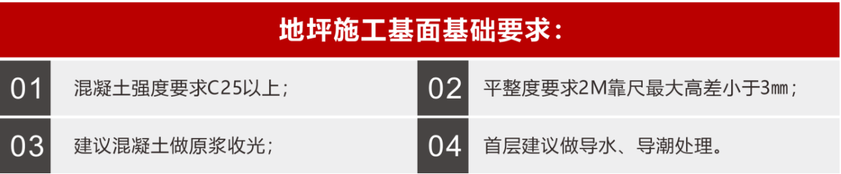 在進(jìn)行施工時(shí),水泥地面基層要預(yù)處理好,如水泥地面翻沙、空鼓、非同批次 澆筑地面的接縫、地面布線開槽形成的接縫以及一樓返潮,對(duì)于需要施工單位現(xiàn)澆筑的地面(尤其在一樓),建議在進(jìn)場(chǎng)施工前澆筑地面并找平(因?yàn)樗嗌皾{地面含水量大,一層采光本身較差,因此必須要地面充分干透才能進(jìn)行施工否側(cè)會(huì)出現(xiàn)面層返水和龜裂。如果待施工地面為一樓或地下室,則需作防水、防潮處理,否則易起鼓起泡 )