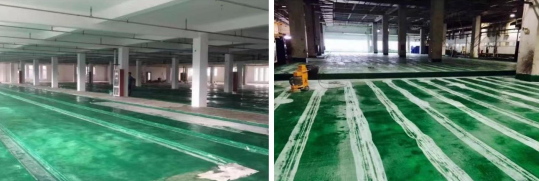清除地面表面的浮漿,使地面與底涂增加附著力,采用自吸塵打磨機(jī)將所有施工面全部打磨平整毛糙,使環(huán)氧底涂能與水泥地面更好的粘合。