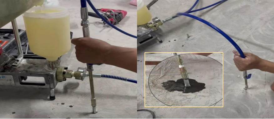 第五步:啟動(dòng)注漿機(jī),將材料注進(jìn)空鼓離層部位,旁邊裂縫處有溢出料為填滿。