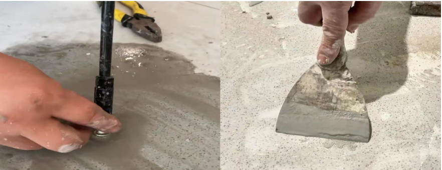 第六步:拆注漿針,并用批刀把修補(bǔ)砂漿材料批到坑洞進(jìn)行填補(bǔ)修復(fù)。