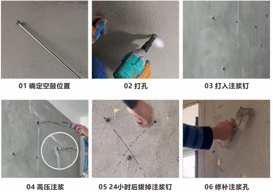 第一步:用鐵錘敲擊墻面,確定空鼓位置并標(biāo)記,建議注漿釘間隔在20公分左右。
