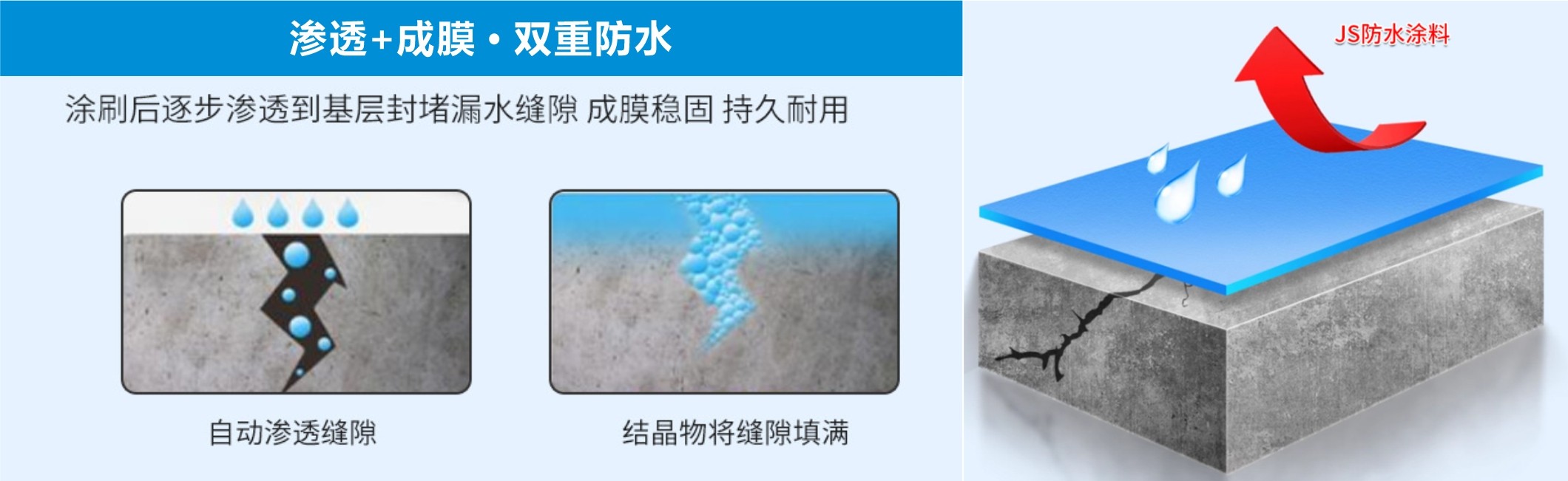 JS防水涂料成膜效果極佳,固化速度也非常快,從而確保了防水層的迅速形成和優(yōu)異性能。耐老化性能優(yōu)異,有效減少了維護和更換的頻率。