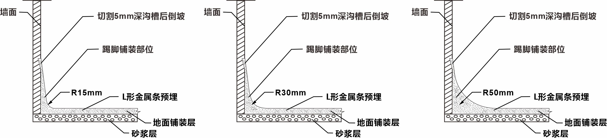 彩砂地坪最好的視覺效果和功能需要,這里需要做一些額外的努力,可以鋪裝出整潔的圓弧踢腳線,一個漂亮的圓弧踢腳線代表著優(yōu)秀的施工工藝。(下圖表示出環(huán)氧彩砂地坪在踢腳線和立柱及設(shè)備基礎(chǔ)處收邊方法,用到的鏝刀規(guī)格分別是R15mm、R30mm、R50mm)。