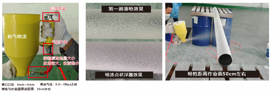 2、噴壺口徑:建議4—6mm之間、噴涂壓力:0.6—1Mpa之間、噴槍與作業(yè)面之間的噴涂距離:50cm左右。有氣噴涂的噴槍具體參數(shù)可根據(jù)實際情況自主調(diào)節(jié);