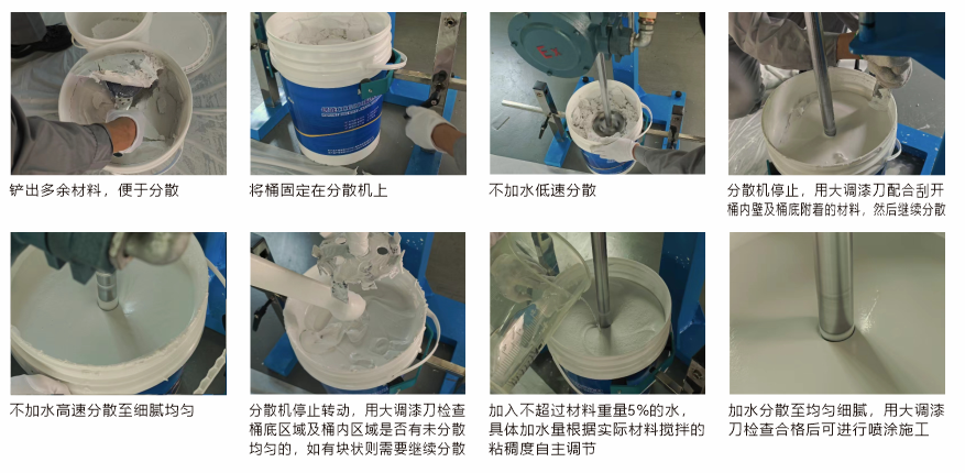 3、對于存儲了一段時間的開桶后有點發(fā)干的材料,分散至相對均勻后再酌情加入少量的水進行粘稠度的調(diào)節(jié),根據(jù)實際批刮施工情況自主調(diào)節(jié)至合適的粘稠度再進行批刮。