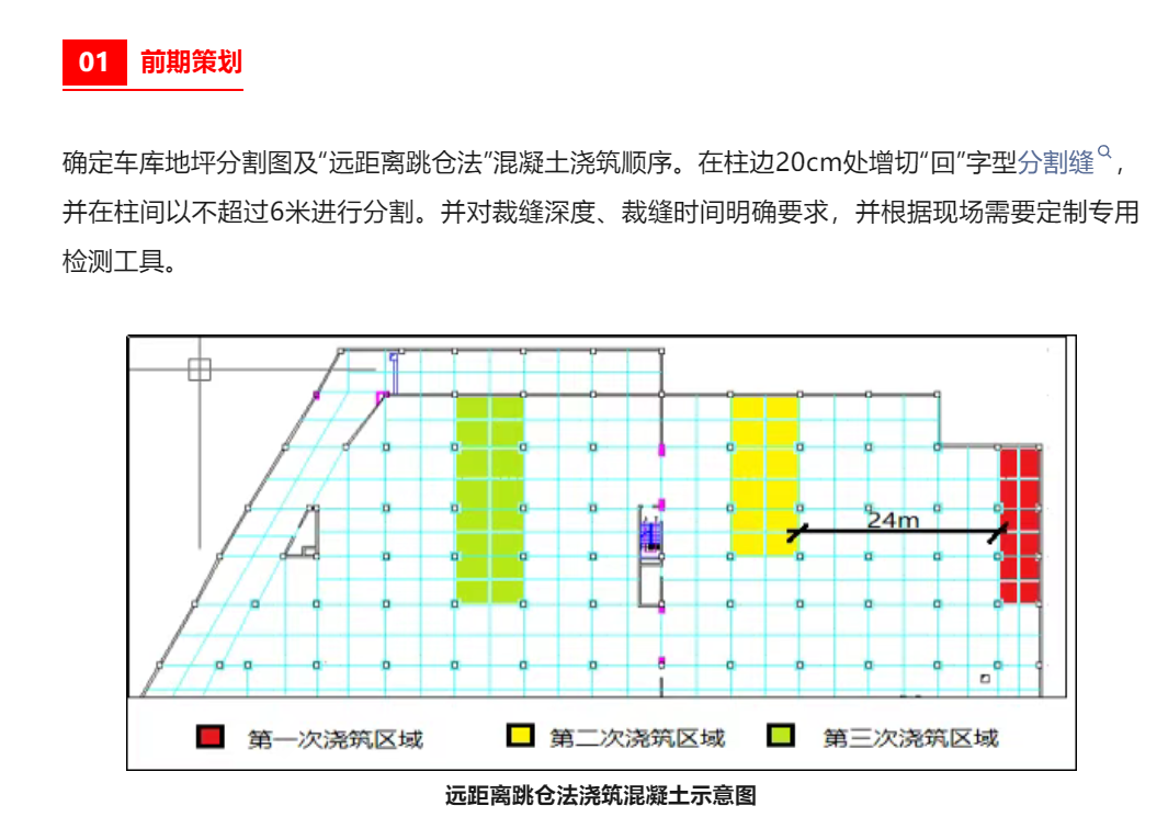 - 混凝土澆筑中使用“遠(yuǎn)距離跳倉法”,收面三遍壓光施工。