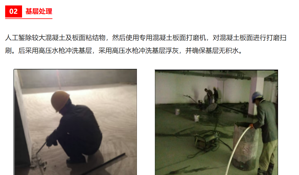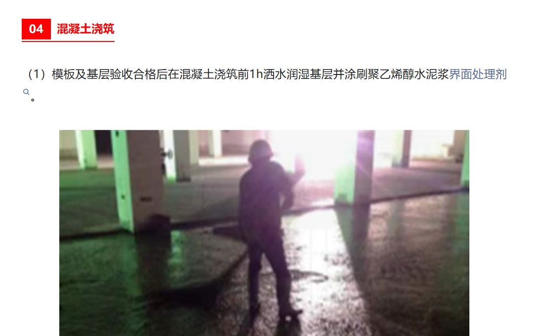 地下車庫地坪施工關(guān)鍵技術(shù):細(xì)石混凝土澆筑很重要- 混凝土澆筑前潤濕基層后涂刷新型聚乙烯醇界面粘合劑,增加混凝土面層和基層板面的粘結(jié)度。