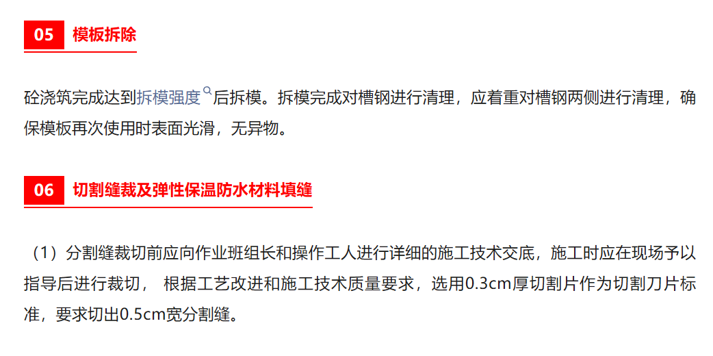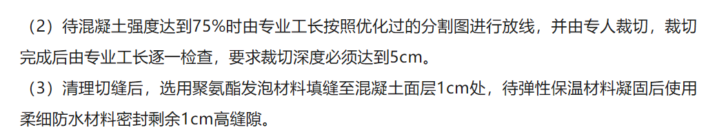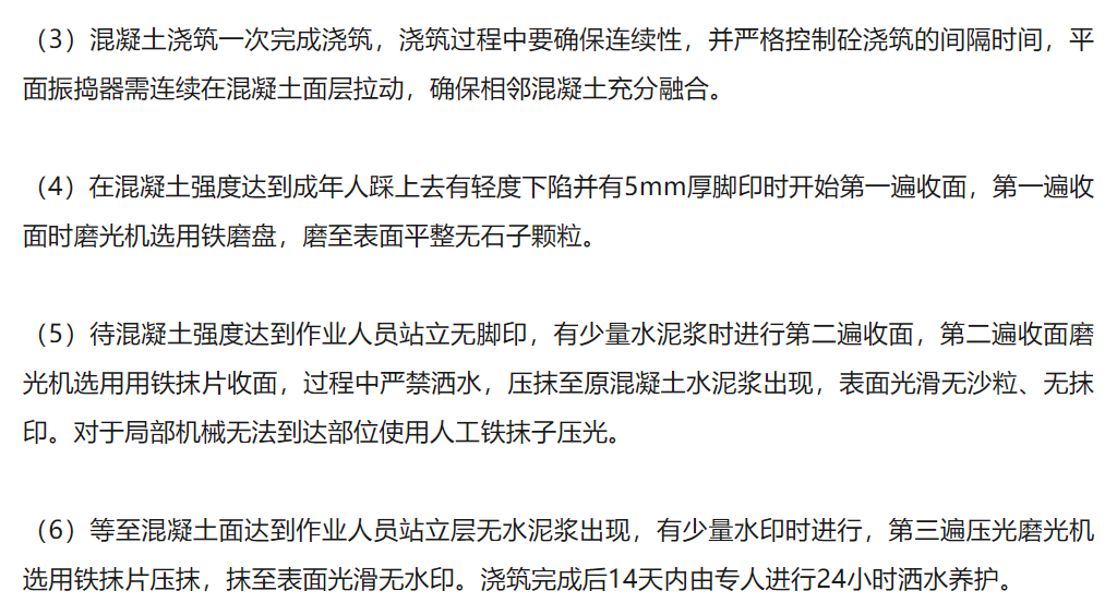 3、混凝土澆筑中使用“遠(yuǎn)距離跳倉法”施工(第二天澆筑場地距第一天澆筑保持距離,確保澆筑中機(jī)械、車輛不擾動(dòng)上次澆筑的混凝土)三遍壓光施工。“遠(yuǎn)距離跳倉法”避免因澆筑中車輛震動(dòng)造成前期澆筑混凝土與基層板面分離造成空鼓,三遍壓光確保了混凝土密實(shí)度,及混凝土干縮造成裂縫。4、彈性保溫防水材料填縫:清理切縫后,選用聚氨酯發(fā)泡材料填縫至混凝土面層。確保混凝土基層切縫處與無切縫處溫度一致,減少因溫度造成混凝土不同程度膨脹收縮造成的裂縫,防水材料密封確保界面處理在無氧、干燥環(huán)境確保了界面劑的安定性。