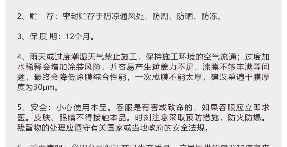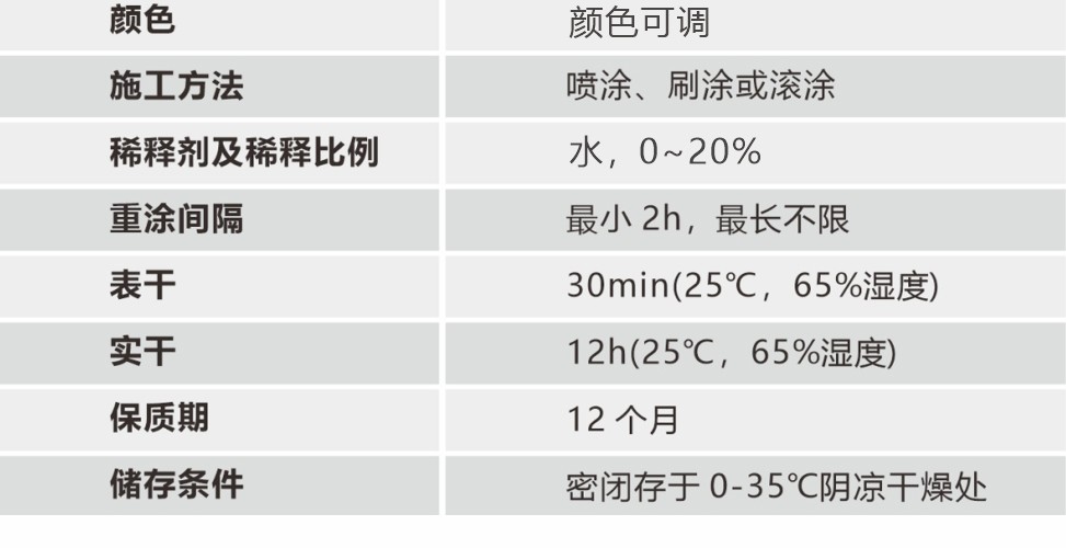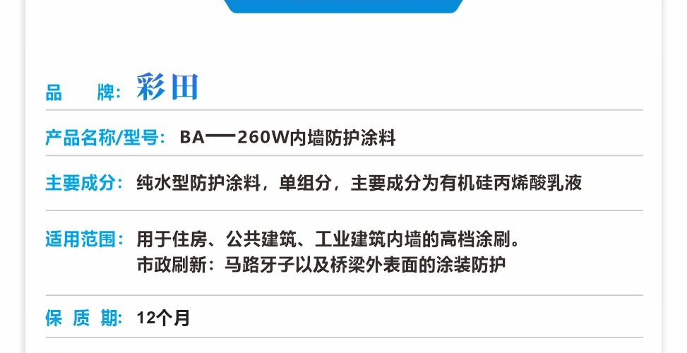 適用各種建筑的內墻涂裝,純水型防護涂料,單組分,主要成分為高檔丙烯酸乳液。具有優(yōu)異的耐候性、耐水性、耐擦洗性。不含有機溶劑,無毒無污染,不燃不爆,以水為分散介質,可以用水稀釋和清洗涂裝用具,屬于環(huán)境友好涂料。