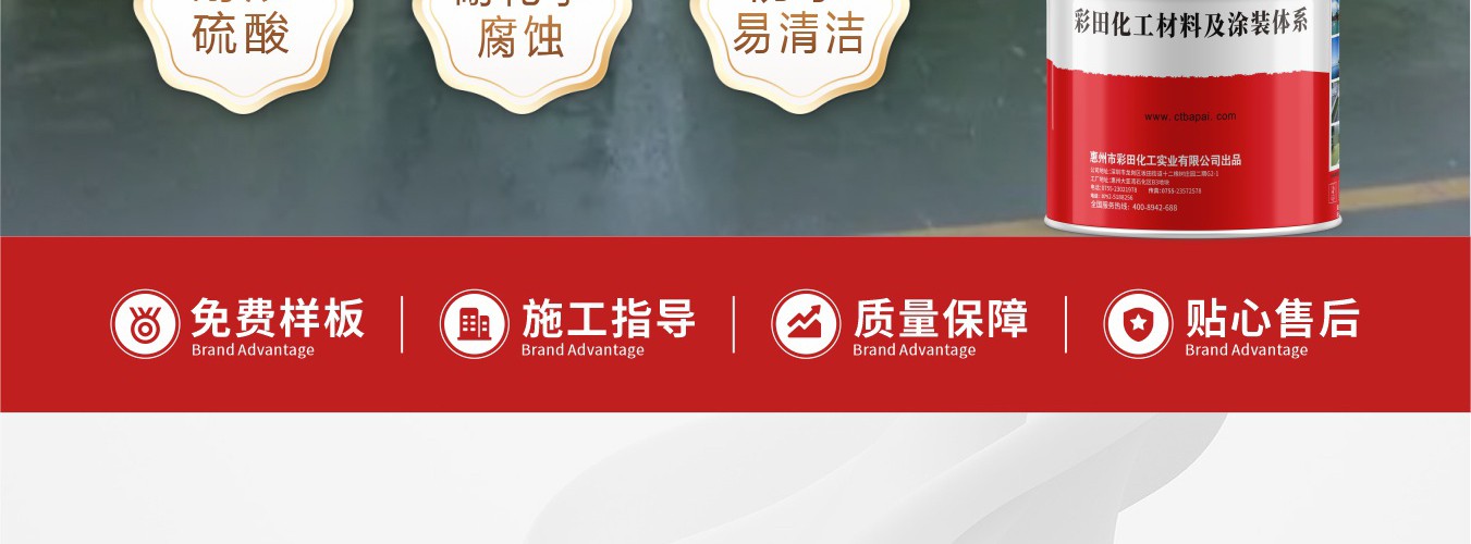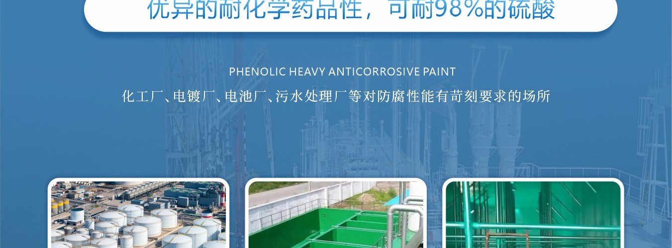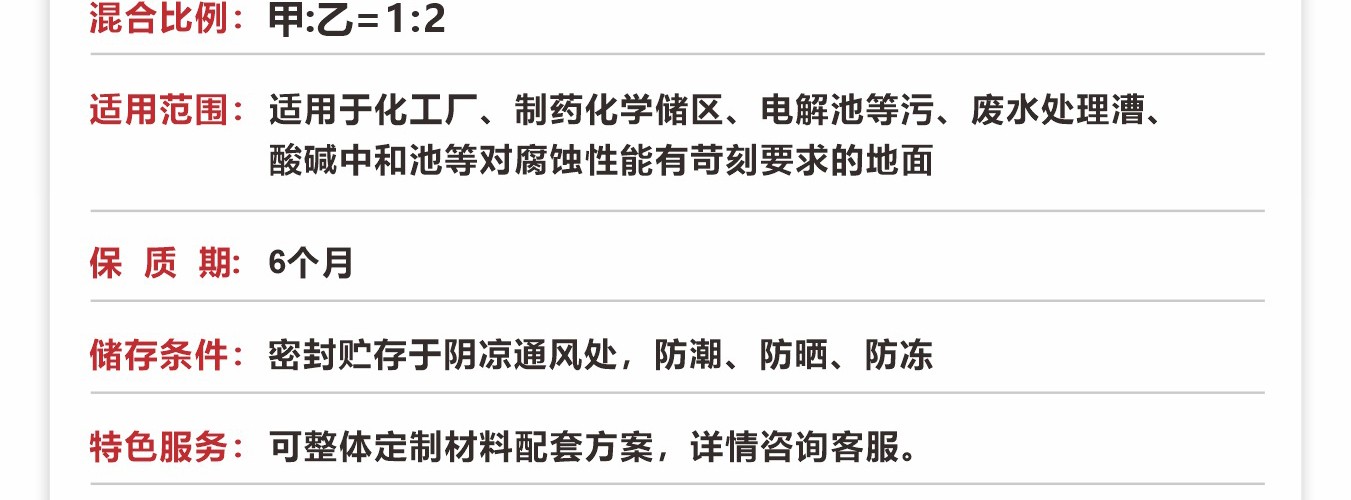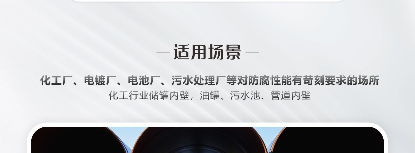 涂層特性: ◆涂層表面平整光滑,可作自流平鏝涂,也可滾涂; ◆無接縫、不起塵、表面易于清潔; ◆具有優(yōu)異的耐化學藥品性,可耐98%的硫酸; ◆良好的機械強度。 適用場所:化工廠、電鍍廠、電池廠、污水處理廠等對防腐性能有苛刻要求的場所。