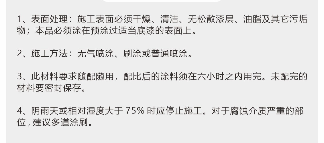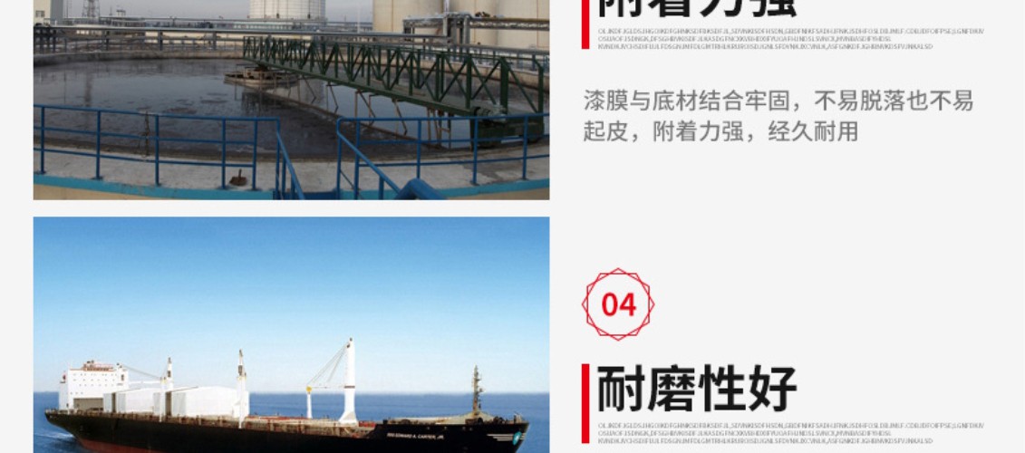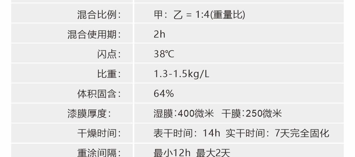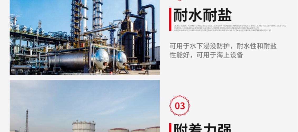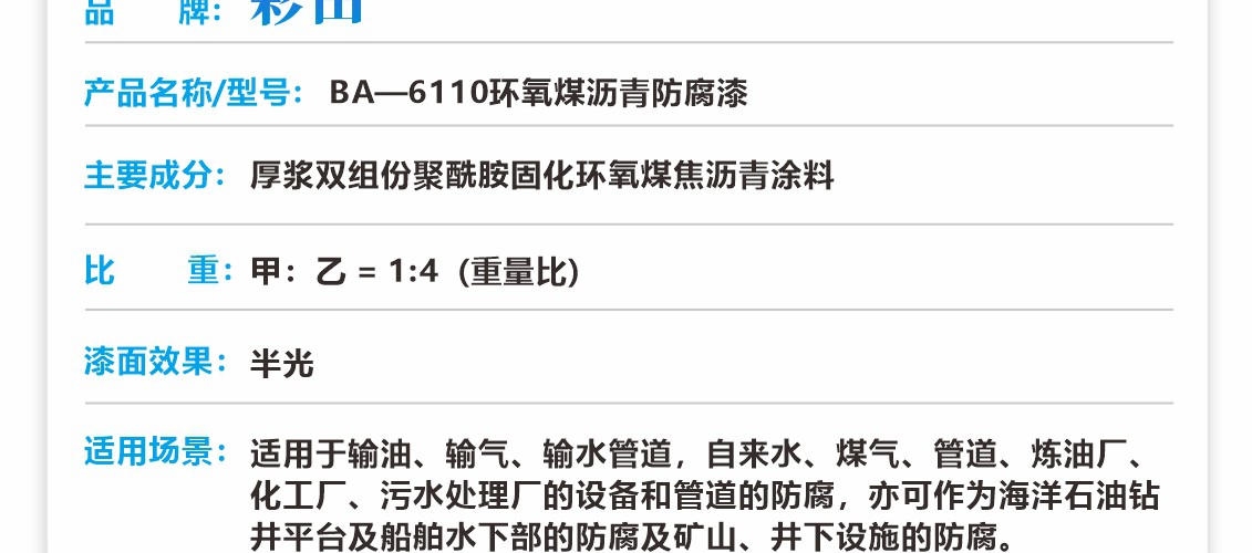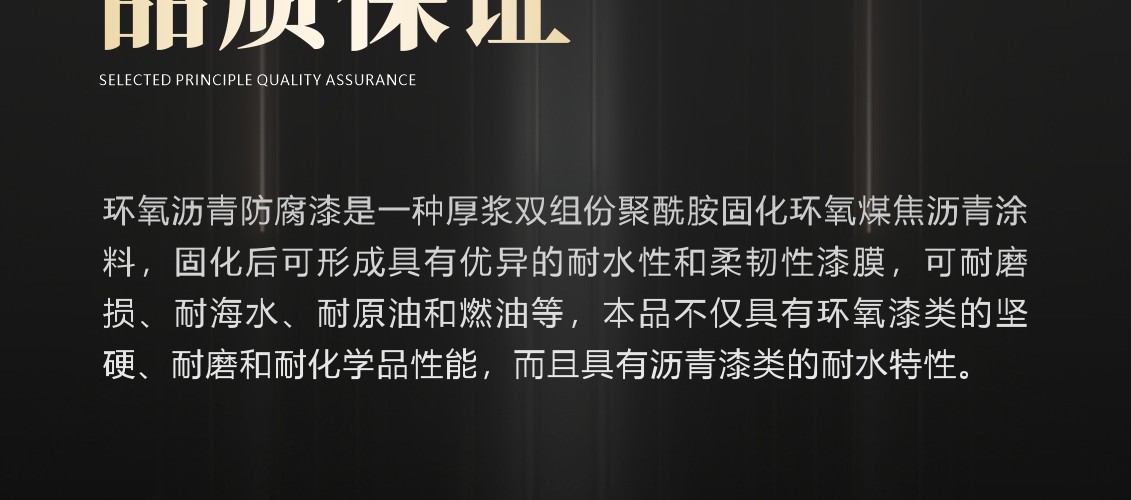 厚漿雙組份聚酰胺固化環(huán)氧煤焦瀝青涂料,固化后可形成具有優(yōu)異的耐水性和柔韌性漆膜,可耐磨損、耐海水、耐原油和燃油等,本品不僅具有環(huán)氧漆類的堅(jiān)硬、耐磨和耐化學(xué)品性能,而且具有瀝青漆類的耐水特性。