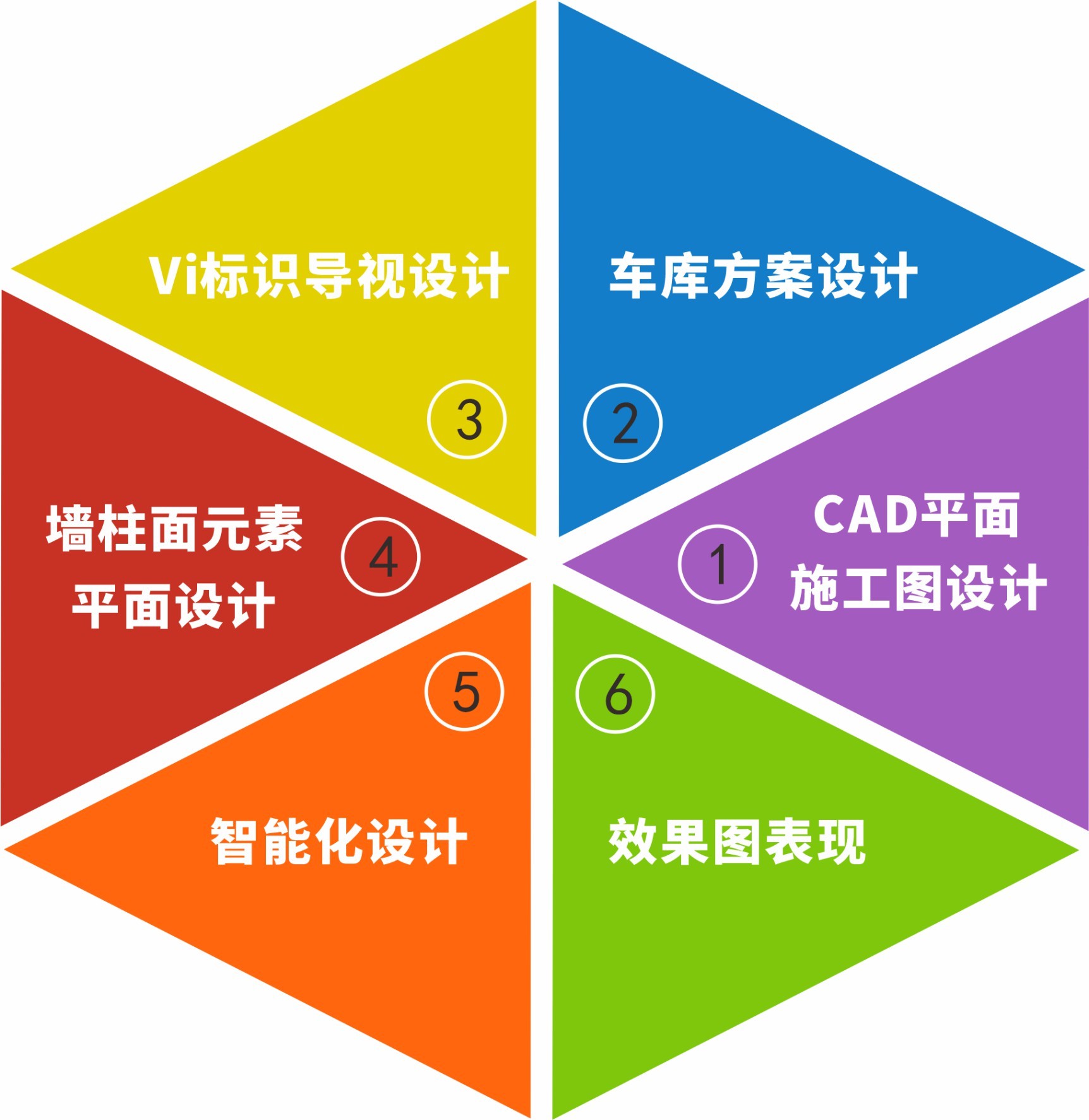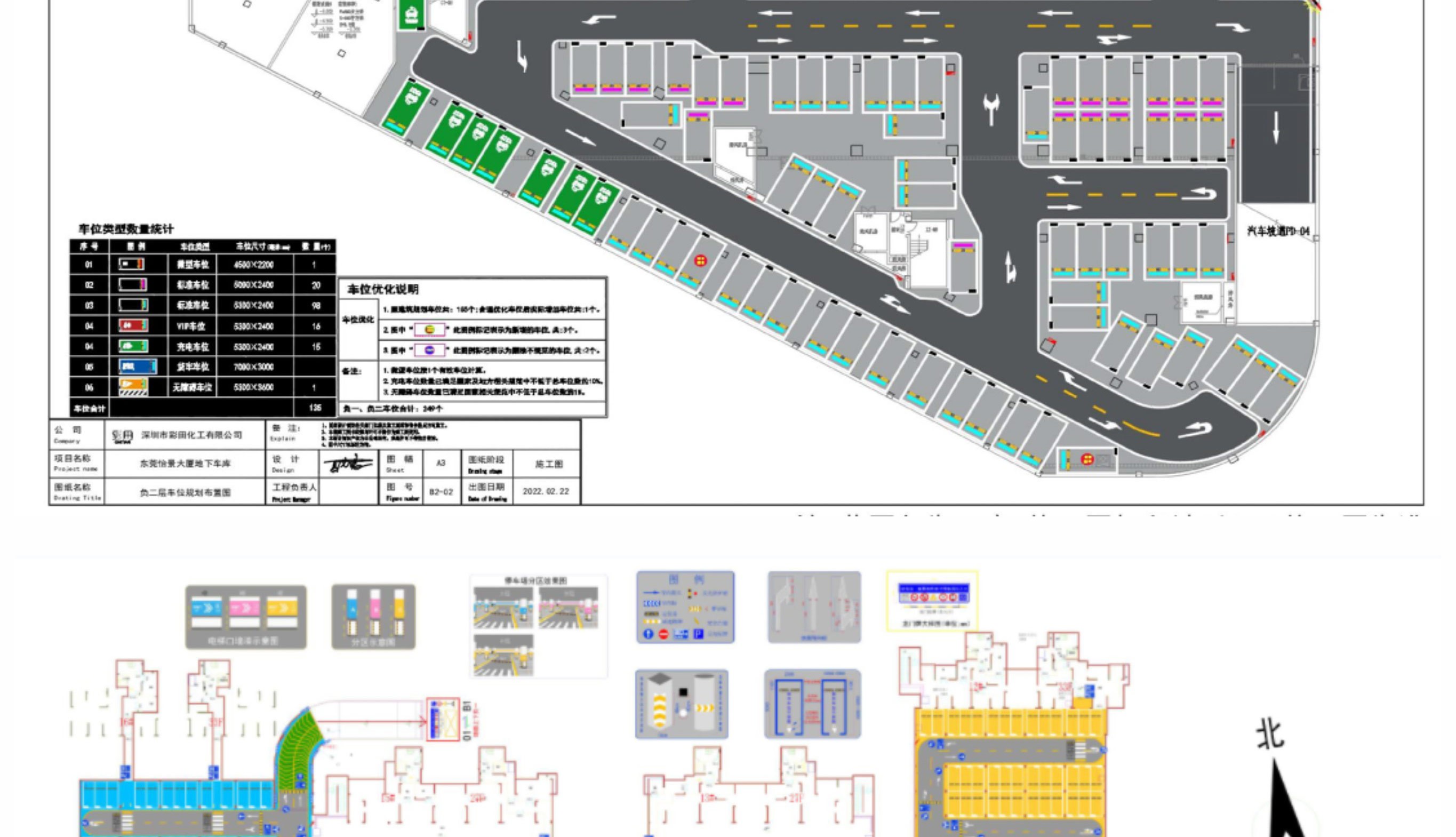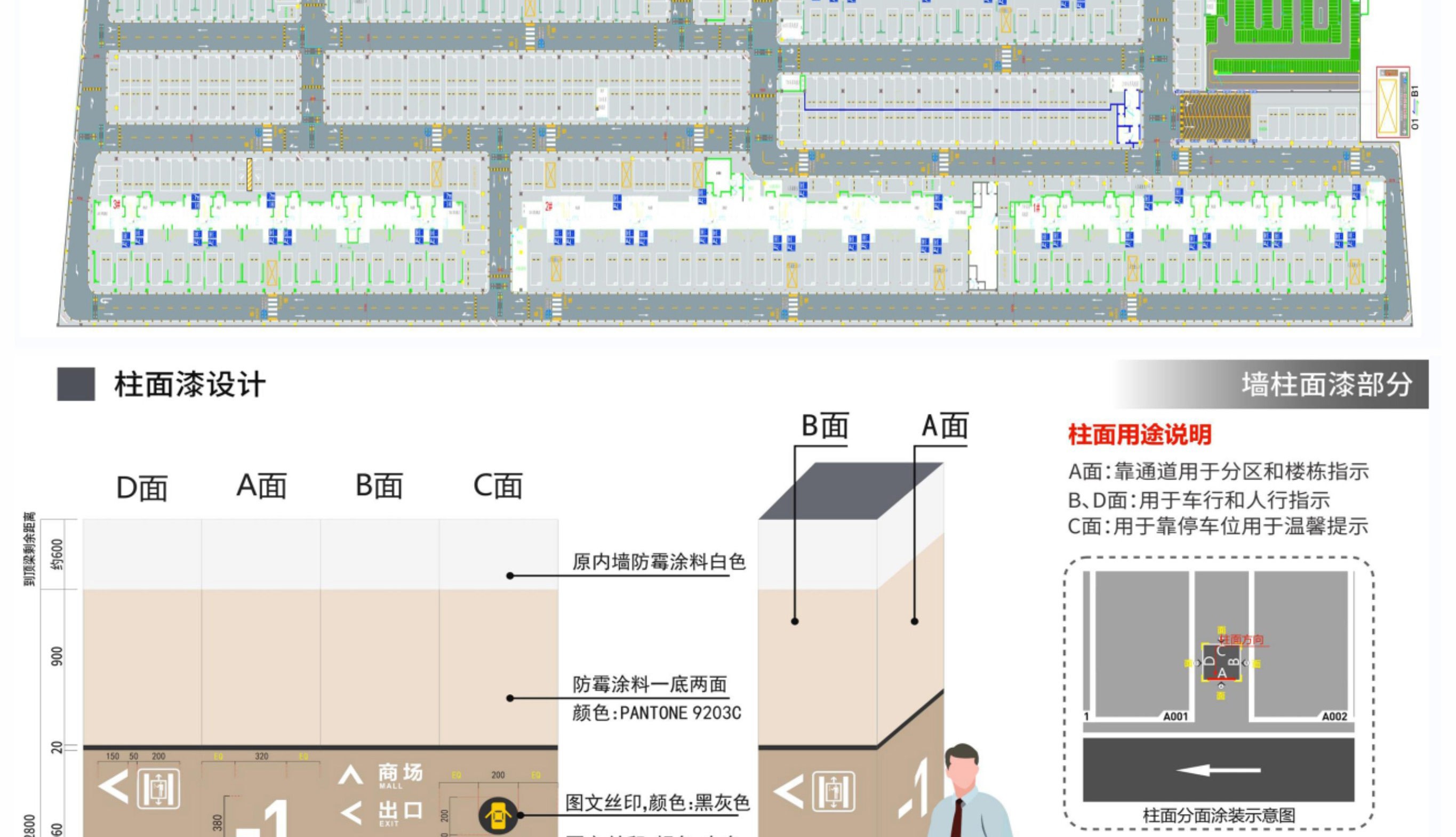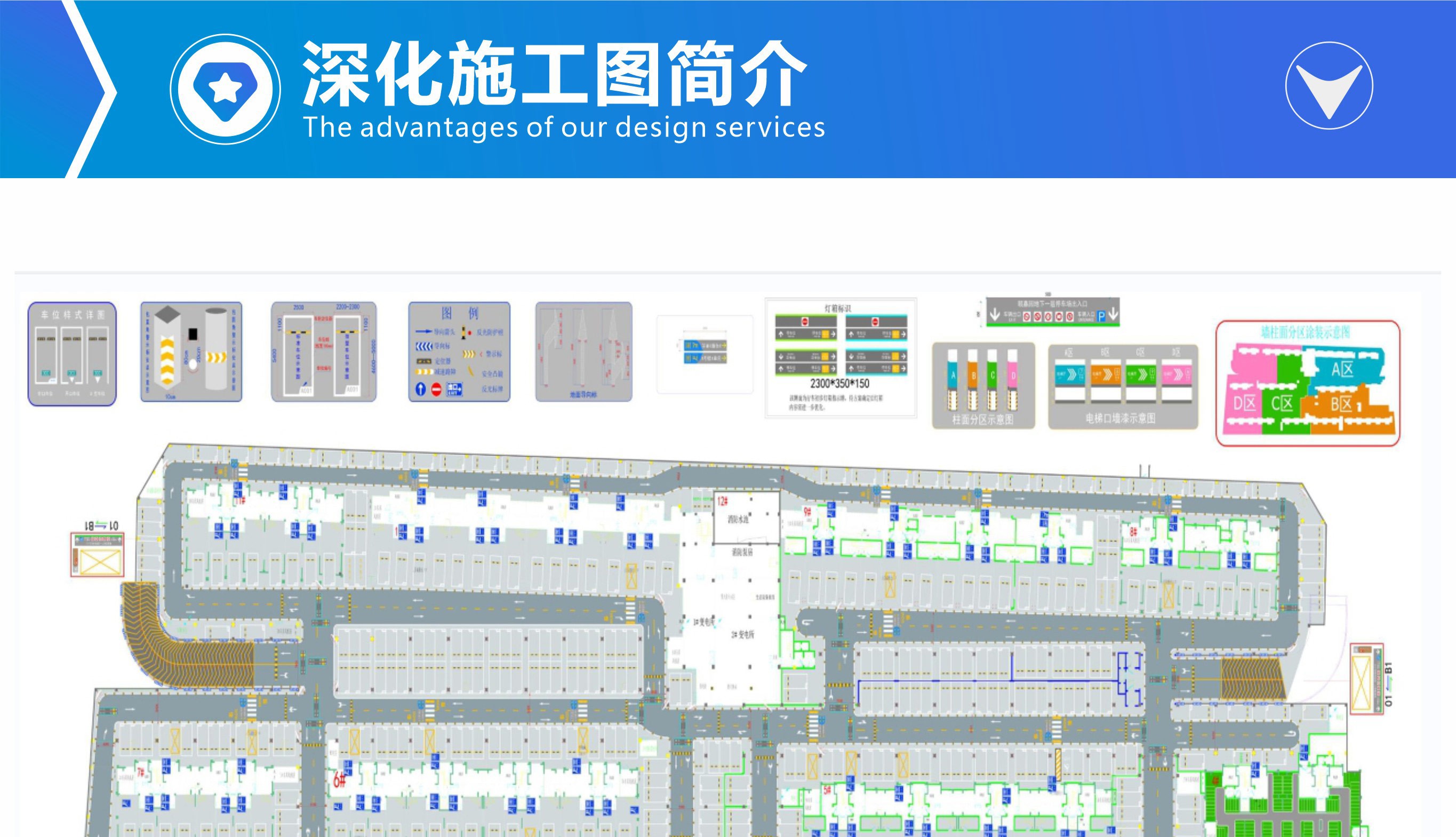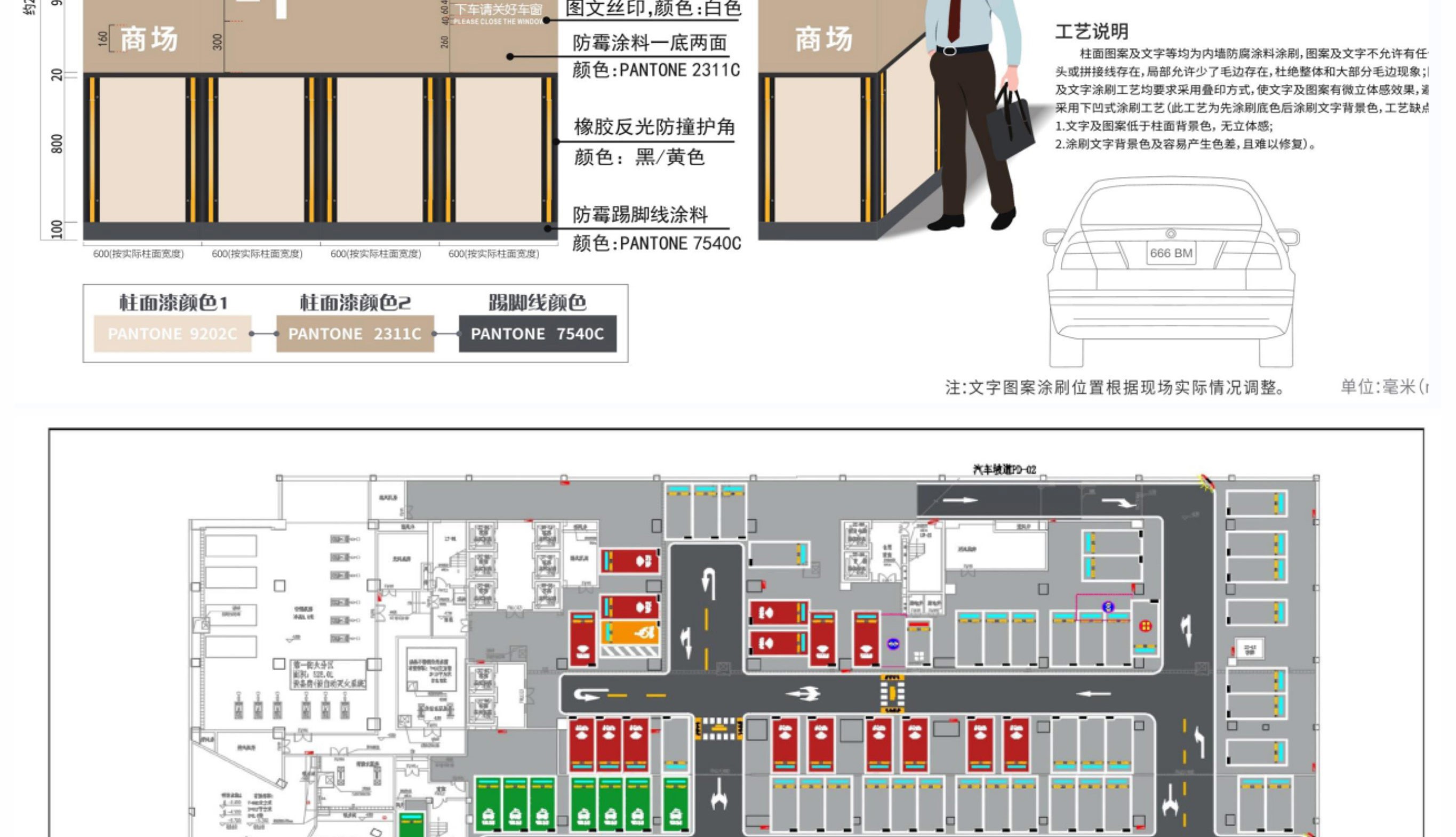 主要對車庫原建筑平面圖進行二次深化設(shè)計,包含停車場設(shè)計說明、施工工藝,常用交通設(shè)施工藝大樣圖及地坪漆施工圖,顏色搭配、分區(qū)范圍,墻柱面漆施工范圍,加上一般的墻柱面文字圖案等標(biāo)識指引設(shè)計,工程量計算等,讓項目達到能施工和報價的目的。