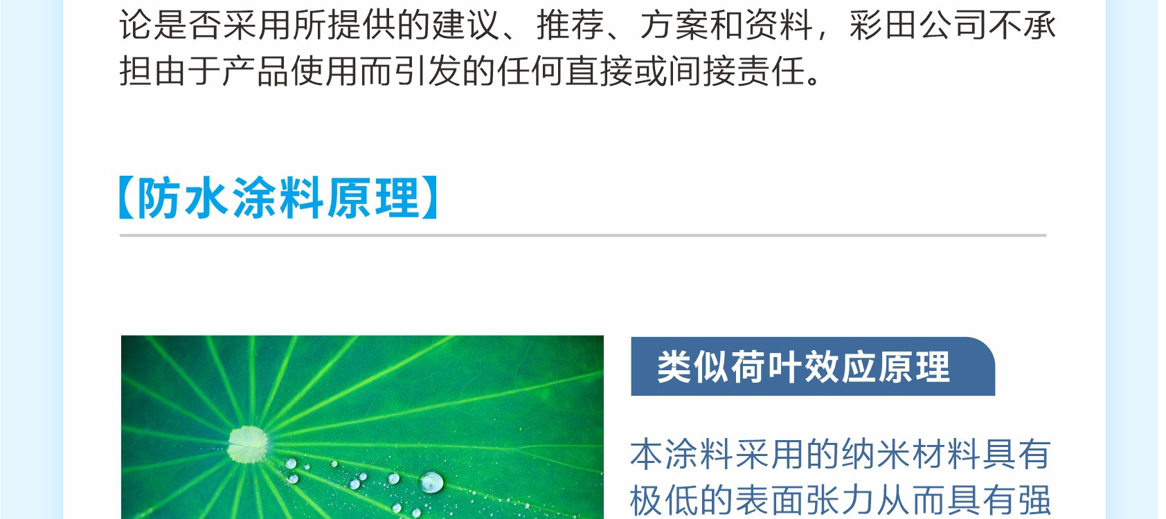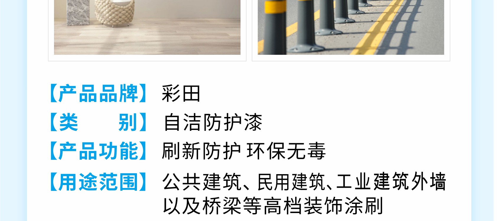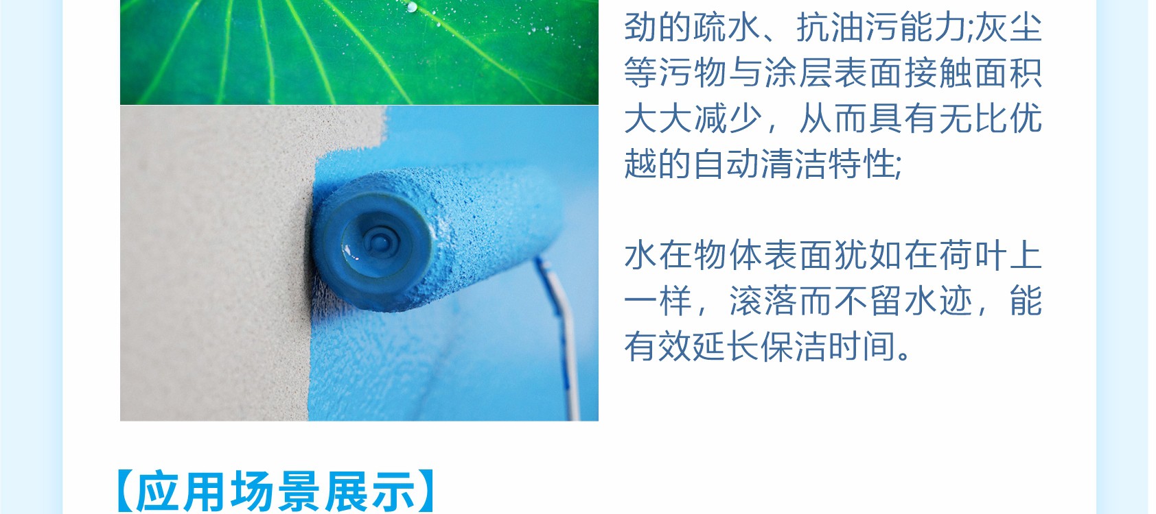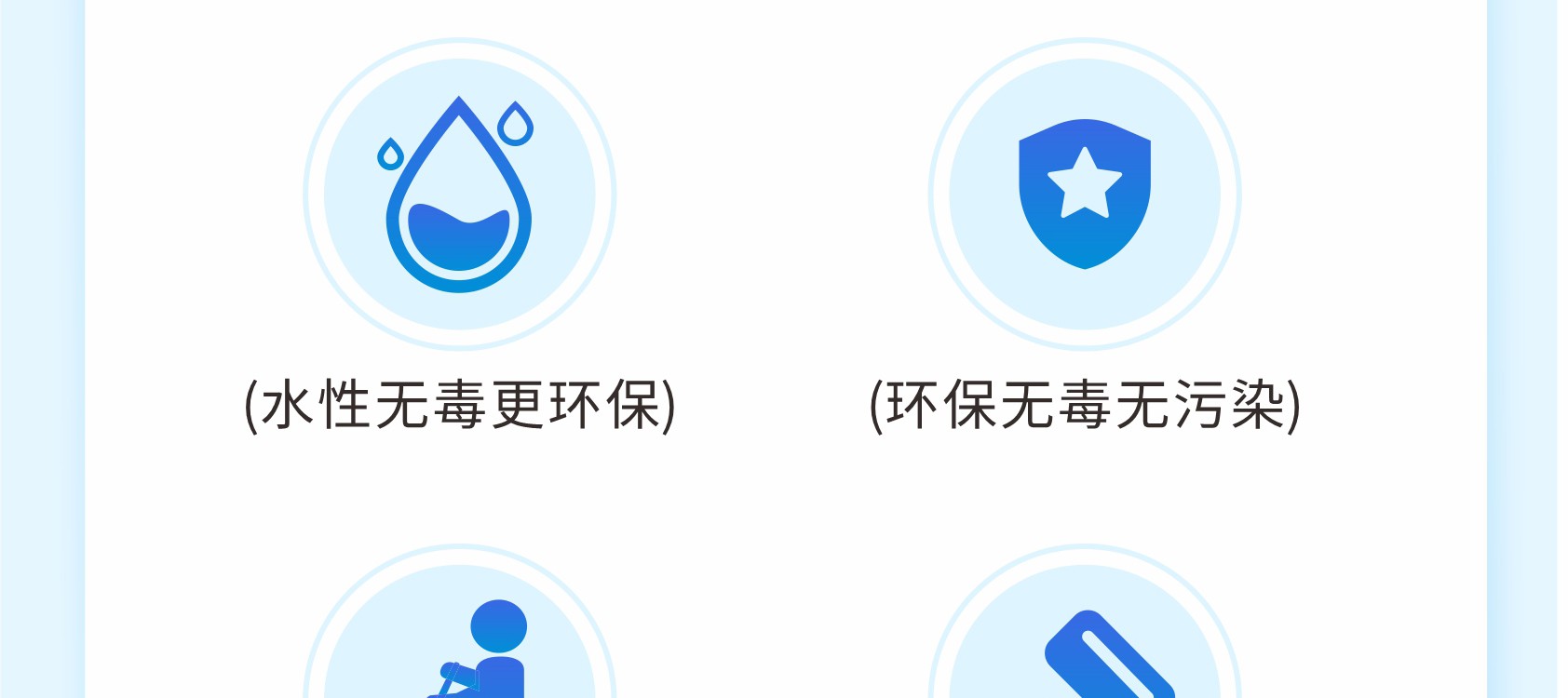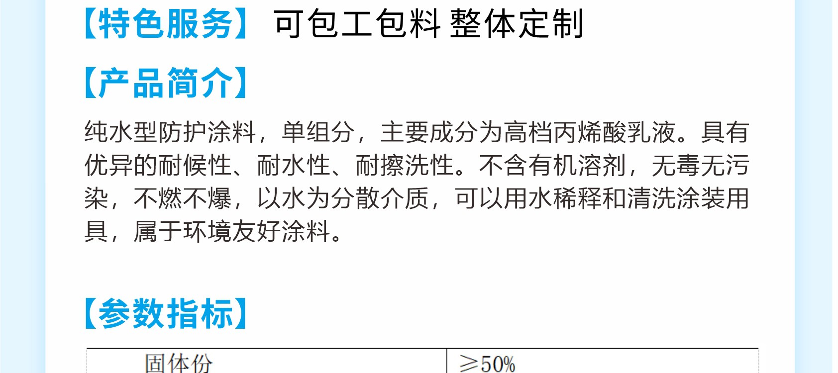 純水性防護(hù)涂料,單組分,主要成分為高檔丙烯酸乳液。具有優(yōu)異的耐候性、耐水性、耐擦洗性。不含有機(jī)溶劑,無毒無污染,不燃不爆,以水為分散介質(zhì),可以用水稀釋和清洗涂裝用具,屬于環(huán)境友好涂料。